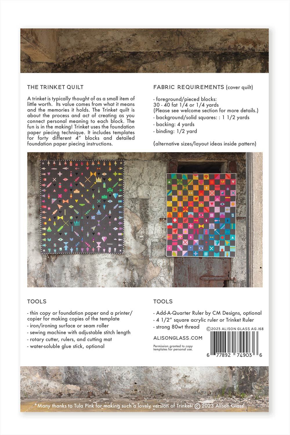 The second edition of the Trinket quilt pattern includes various exciting additions and updates, such as a gallery of quilts, an alternate layout option, a coloring/block arranging sheet, the 2019 bonus block, and extra tips. The booklet itself is particularly special, with a velvety full photo cover and an additional informative band. The band includes all of the usual pattern information, allowing the pattern cover to showcase a full-spread photo of the original Trinket quilt, along with a stunning version created by Tula Pink and quilted by Angela Walters!